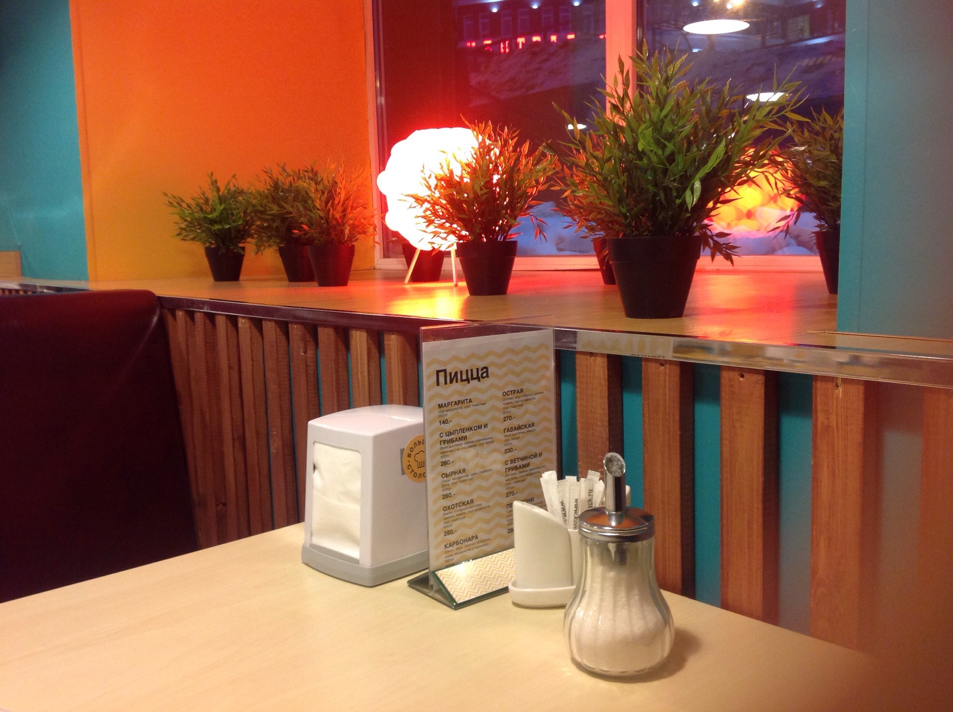 Очень неудобные стулья и узкие столы. Вчетвером сложно за столом разместиться (